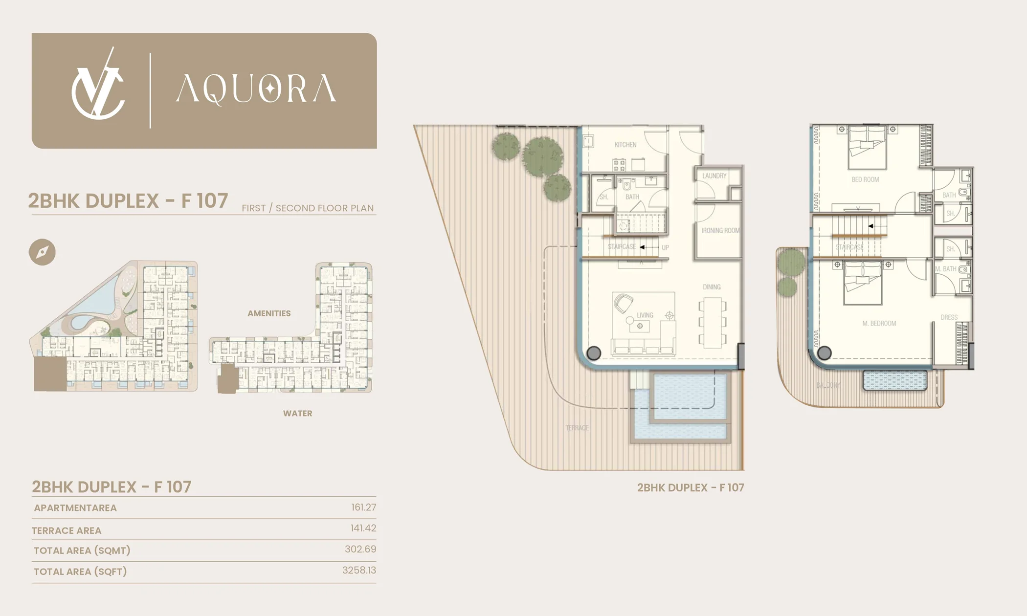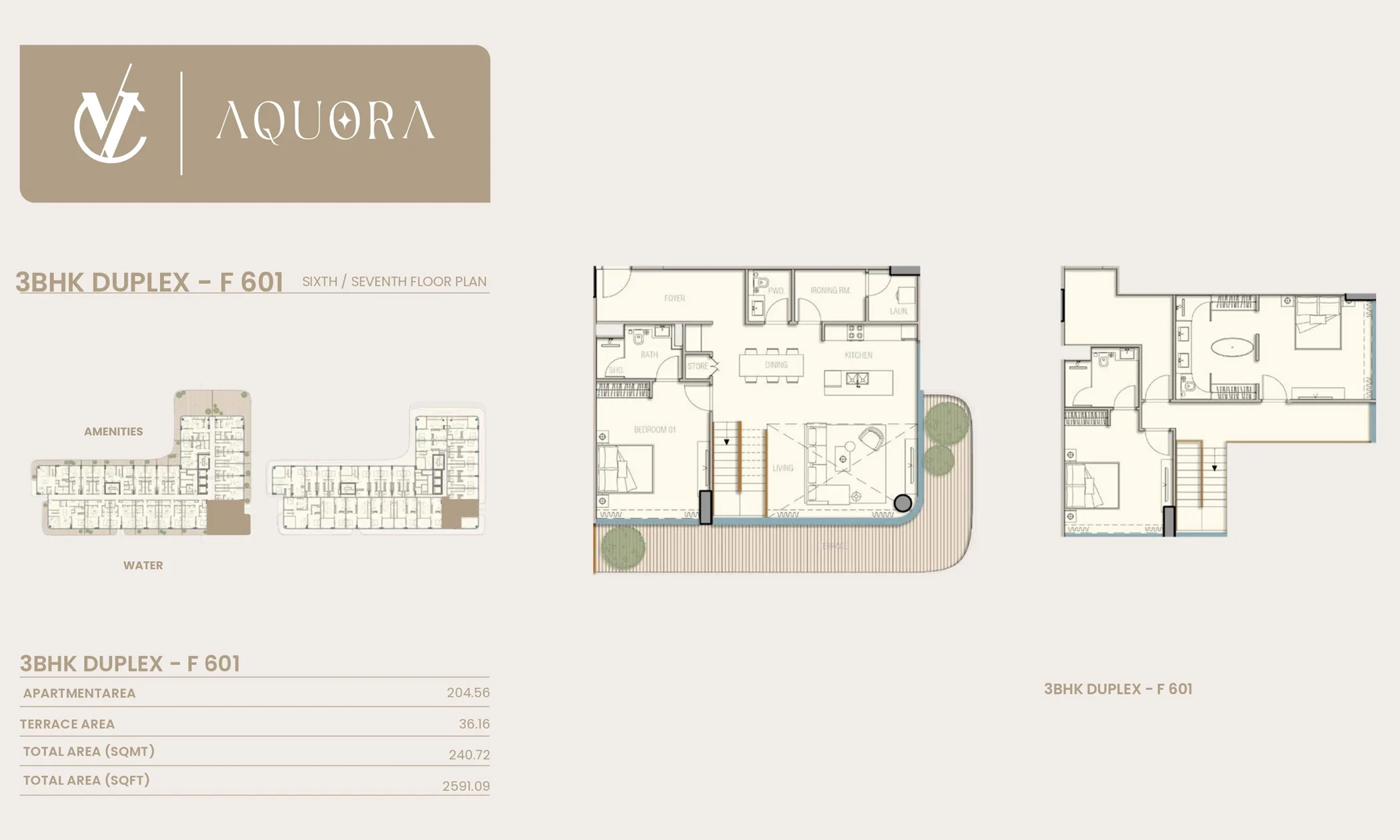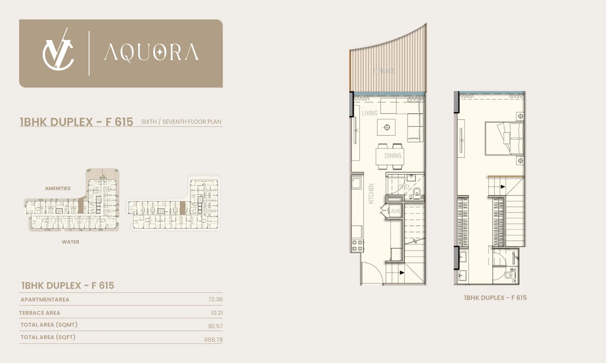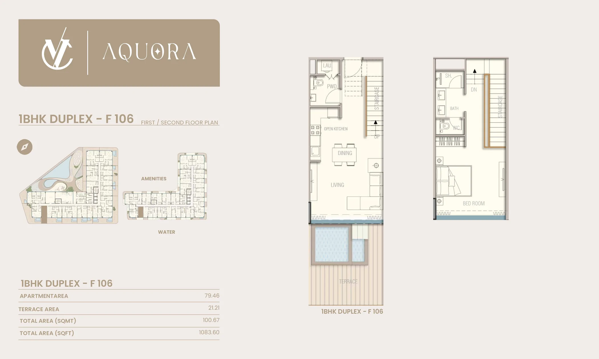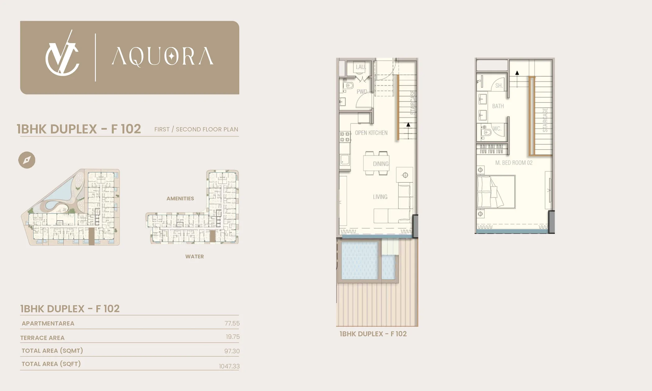 Aquora offers 1-, 2-, and 3-bedroom apartments, including simplex residences and a selection of duplex layouts. Most homes include private balconies or full-depth terraces, with select residences featuring corner terraces for wider views and greater privacy. Interiors follow a premium, contemporary specification with efficient open-plan living and dining areas, practical kitchen planning, well-sized bedrooms, and clear separation between social and private zones.