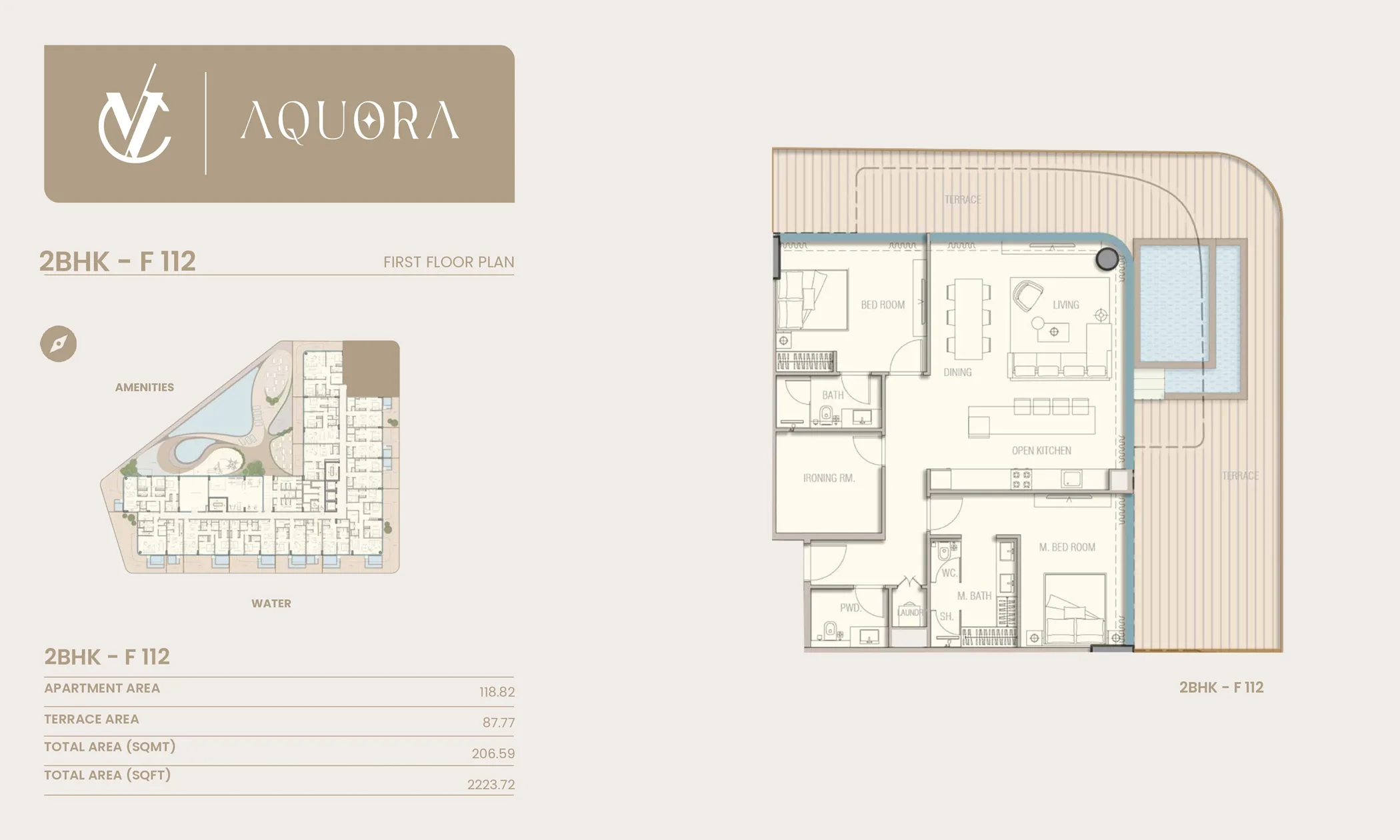 Aquora is defined by a sculptural architectural form with softened edges, flowing balcony lines, and layered terraces that echo the movement of water. The building’s design emphasises horizontality and openness, ensuring strong visual connections to the waterfront while maintaining privacy across residential levels. The mid-rise scale reinforces a boutique residential atmosphere.
