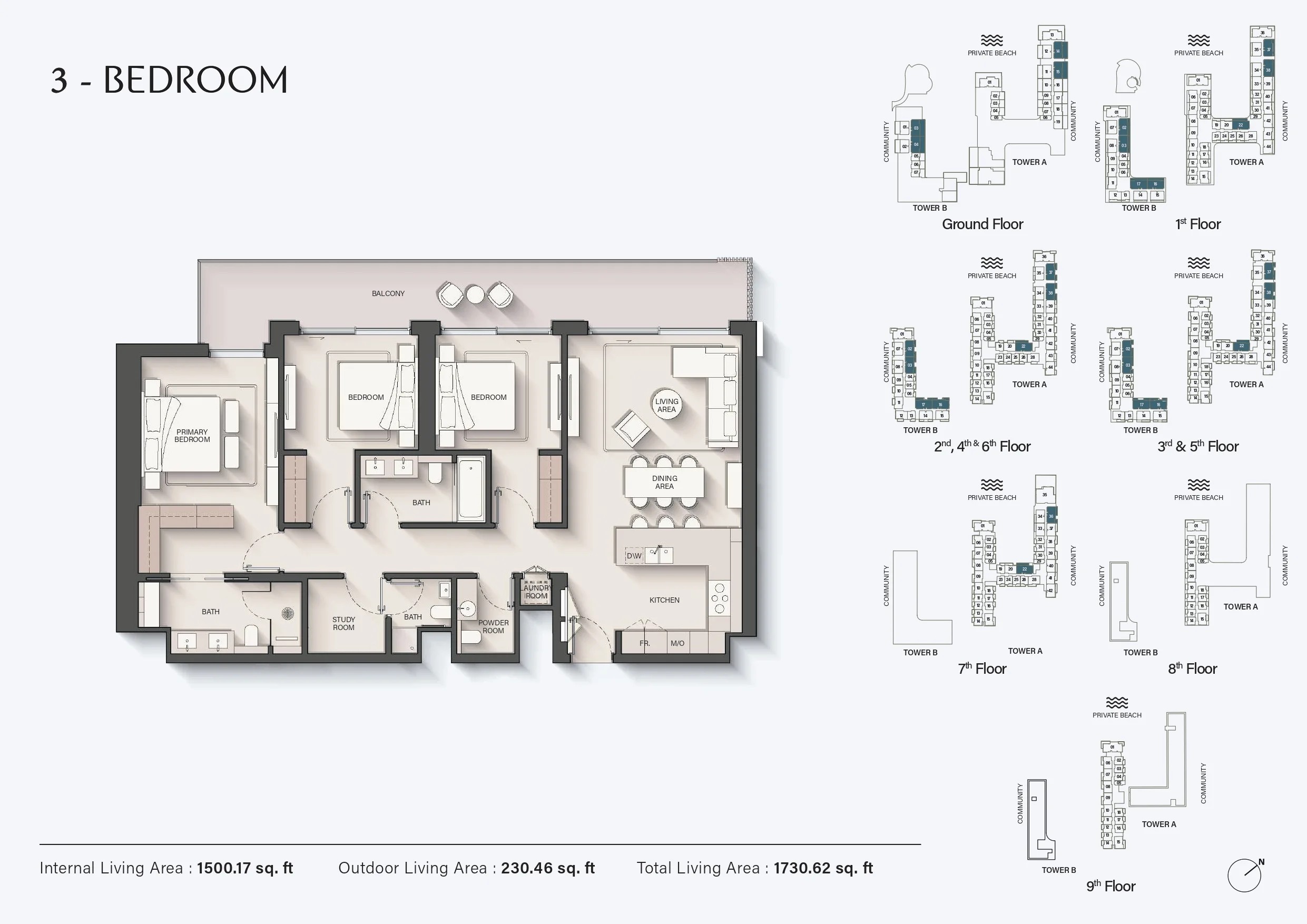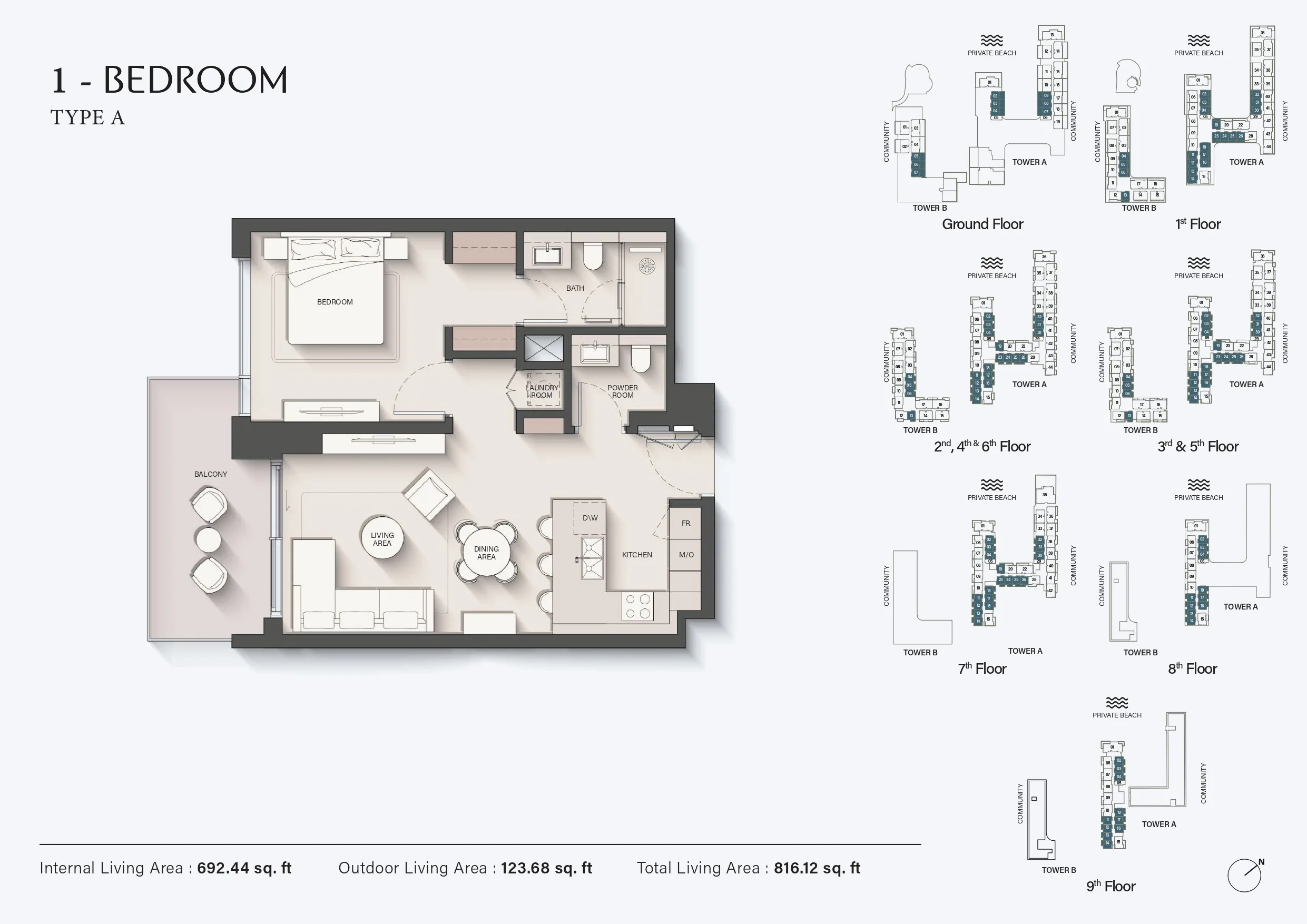 The project offers a collection of studios, 1-bedroom, 2-bedroom, 3-bedroom, and 4-bedroom apartments, along with exclusive penthouse residences. Homes are distributed across two low-rise residential towers, maintaining privacy and a relaxed coastal scale. Layouts are designed to maximise views, natural ventilation, and spatial comfort, appealing to end users and long-term investors.