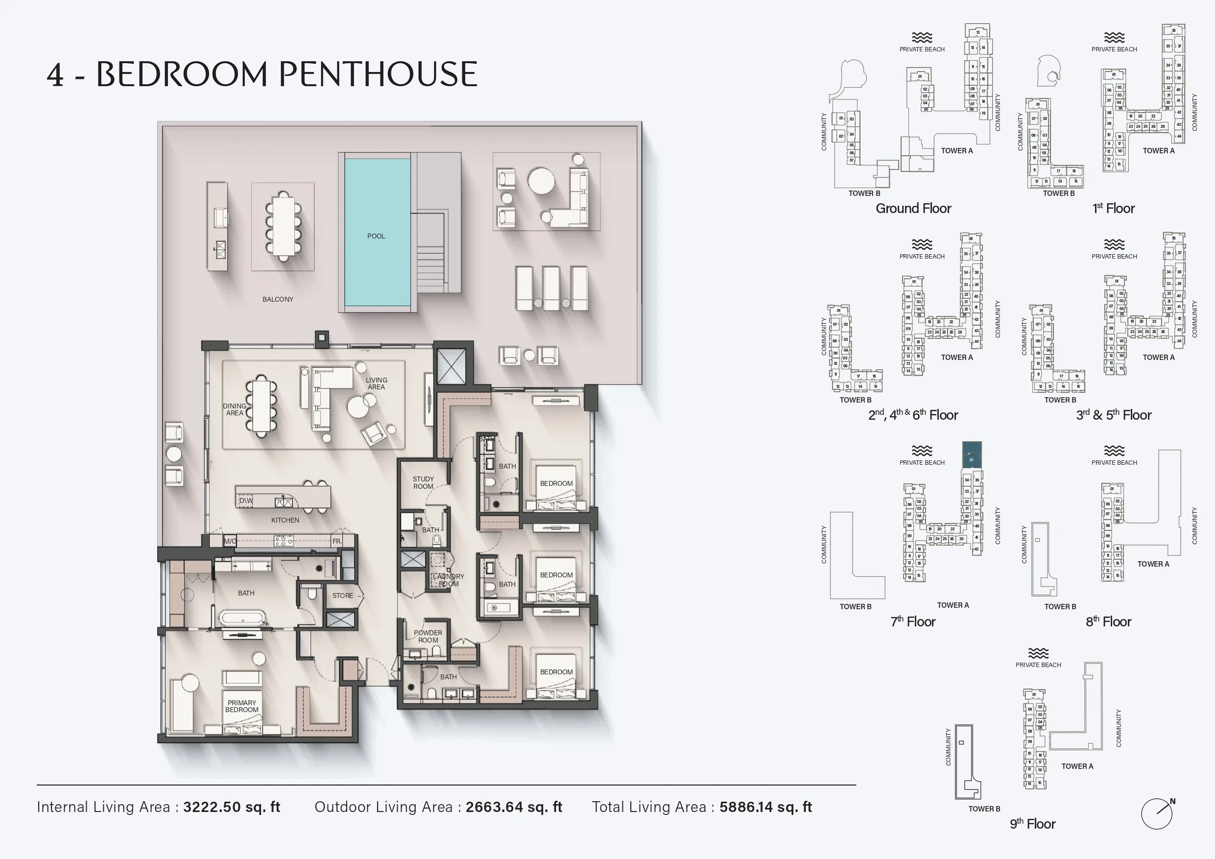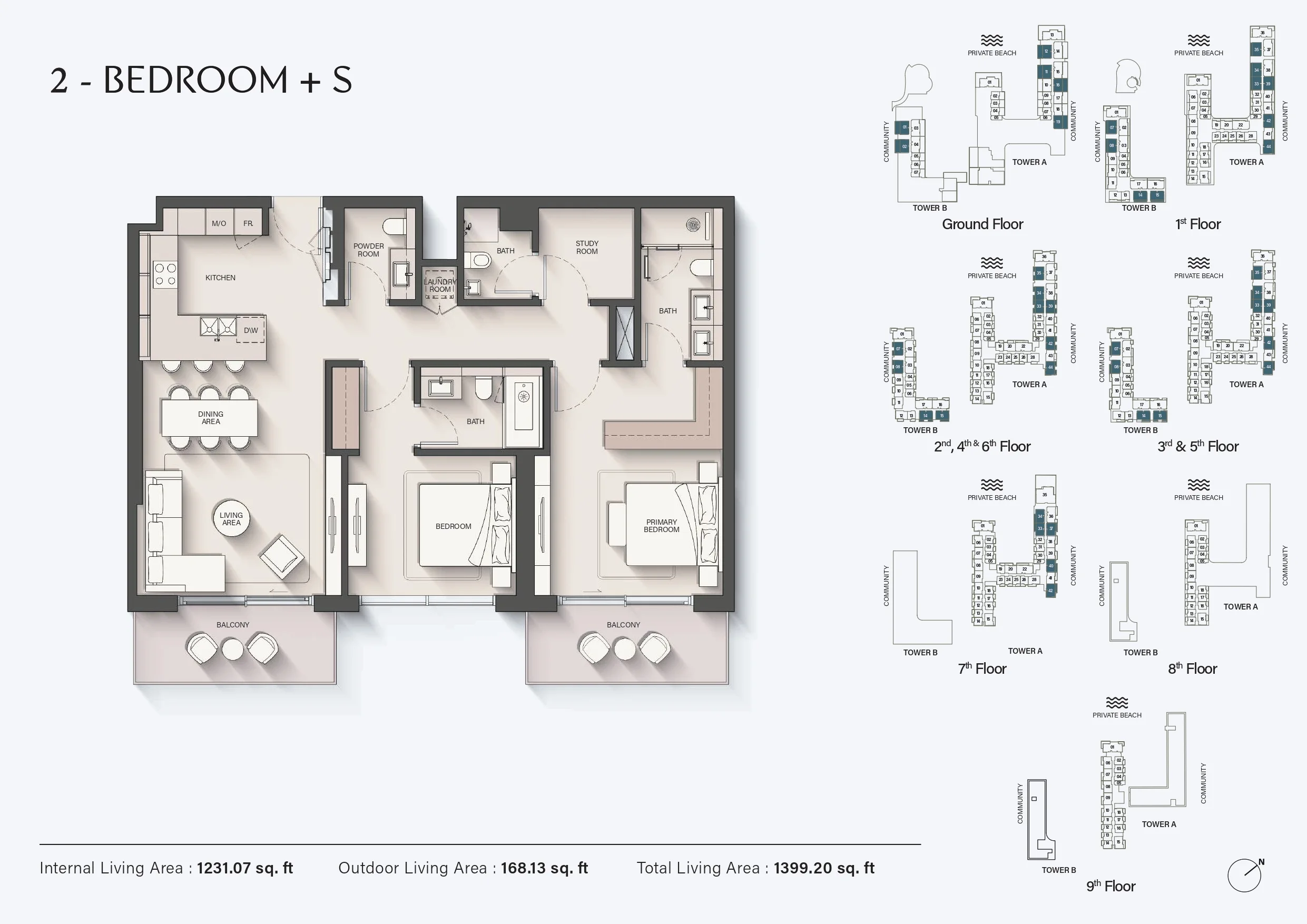 Ellington Sands 2 offers a refined selection of studios, 1-bedroom, 2-bedroom, 3-bedroom, and 4-bedroom apartments, along with limited penthouse residences. Homes are designed to capture sea views and maximise the connection between interior spaces and the beachfront environment. The residential layout is supported by a well-defined vertical circulation system: Tower A is served by seven passenger elevators and one service elevator, while Tower B features three passenger elevators and one service elevator.