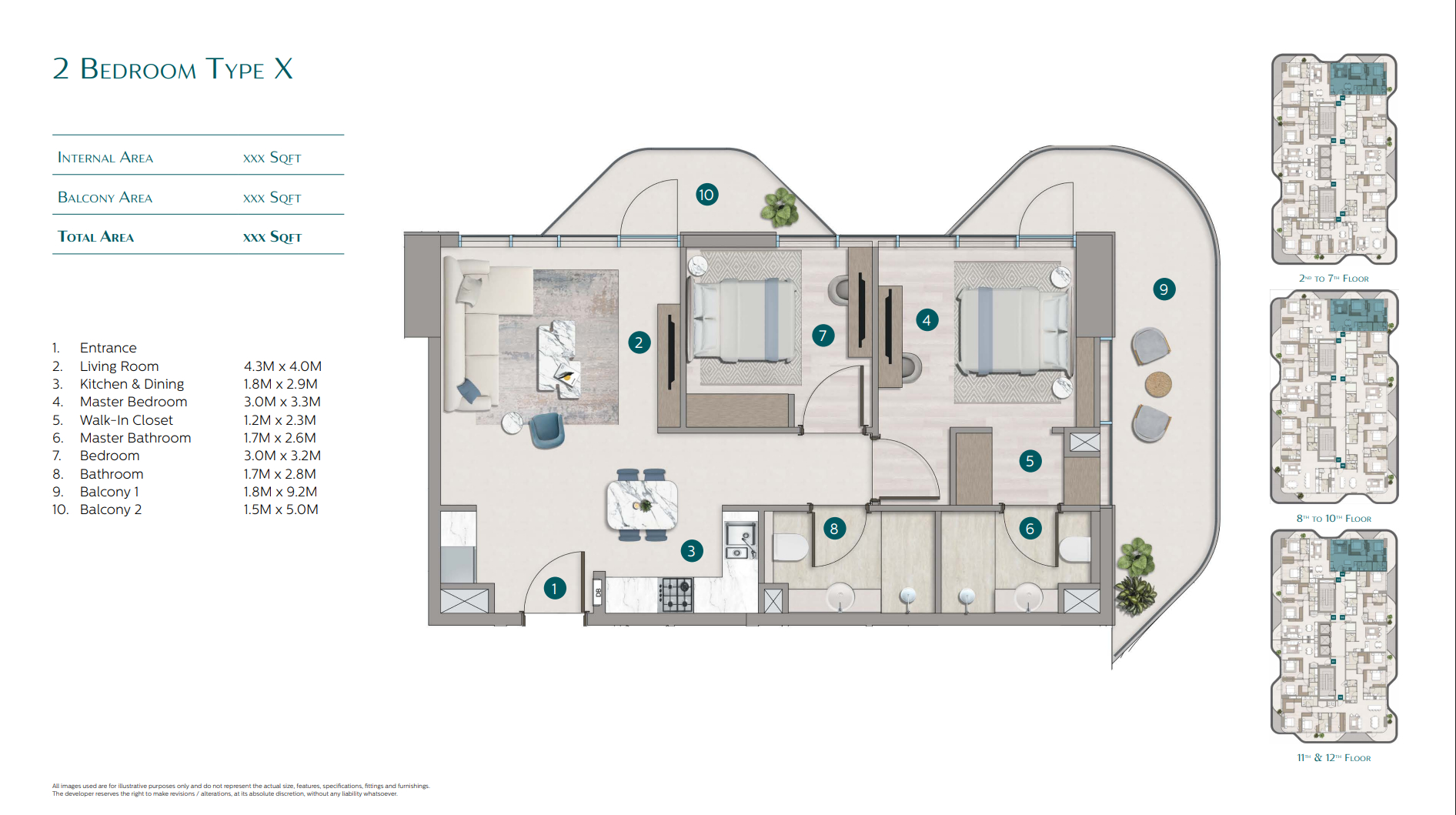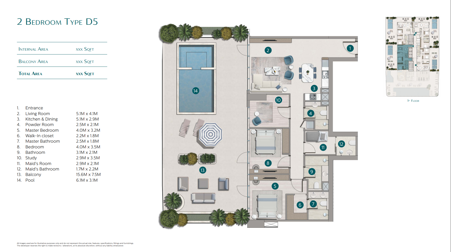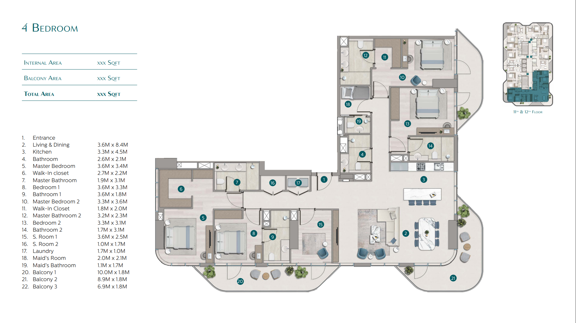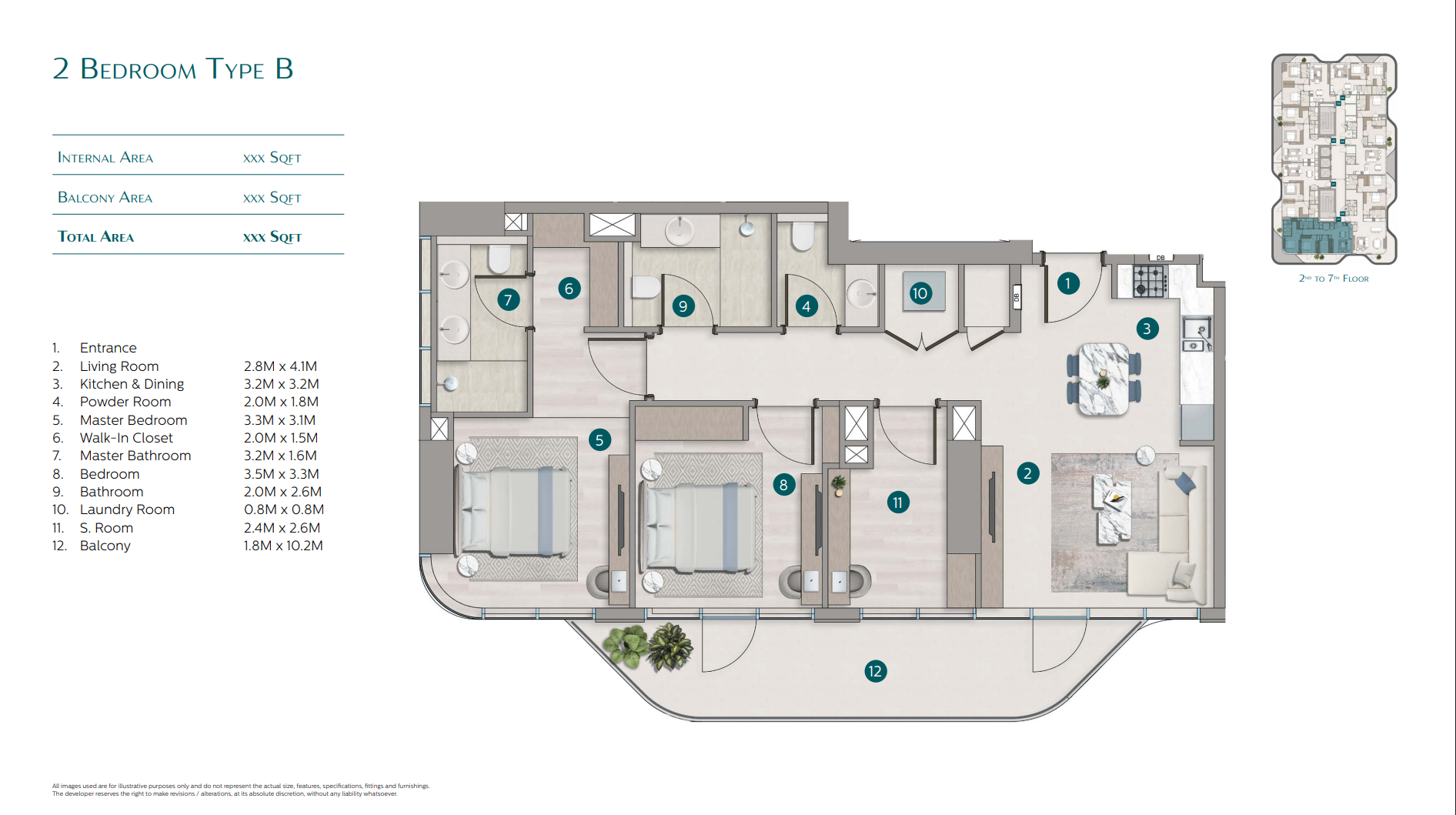 Flora Shore offers a refined selection of 2- to 4-bedroom apartments and penthouses, including layouts with maid’s or study rooms. Unit sizes range from 983 to 3,181 sq.ft., with several podium-level apartments featuring private pools and expansive terraces. The collection spans 12 residential floors, combining compact two-bedroom residences with larger family-oriented layouts and exclusive top-floor penthouses overlooking the sea and the Dubai Islands skyline.
