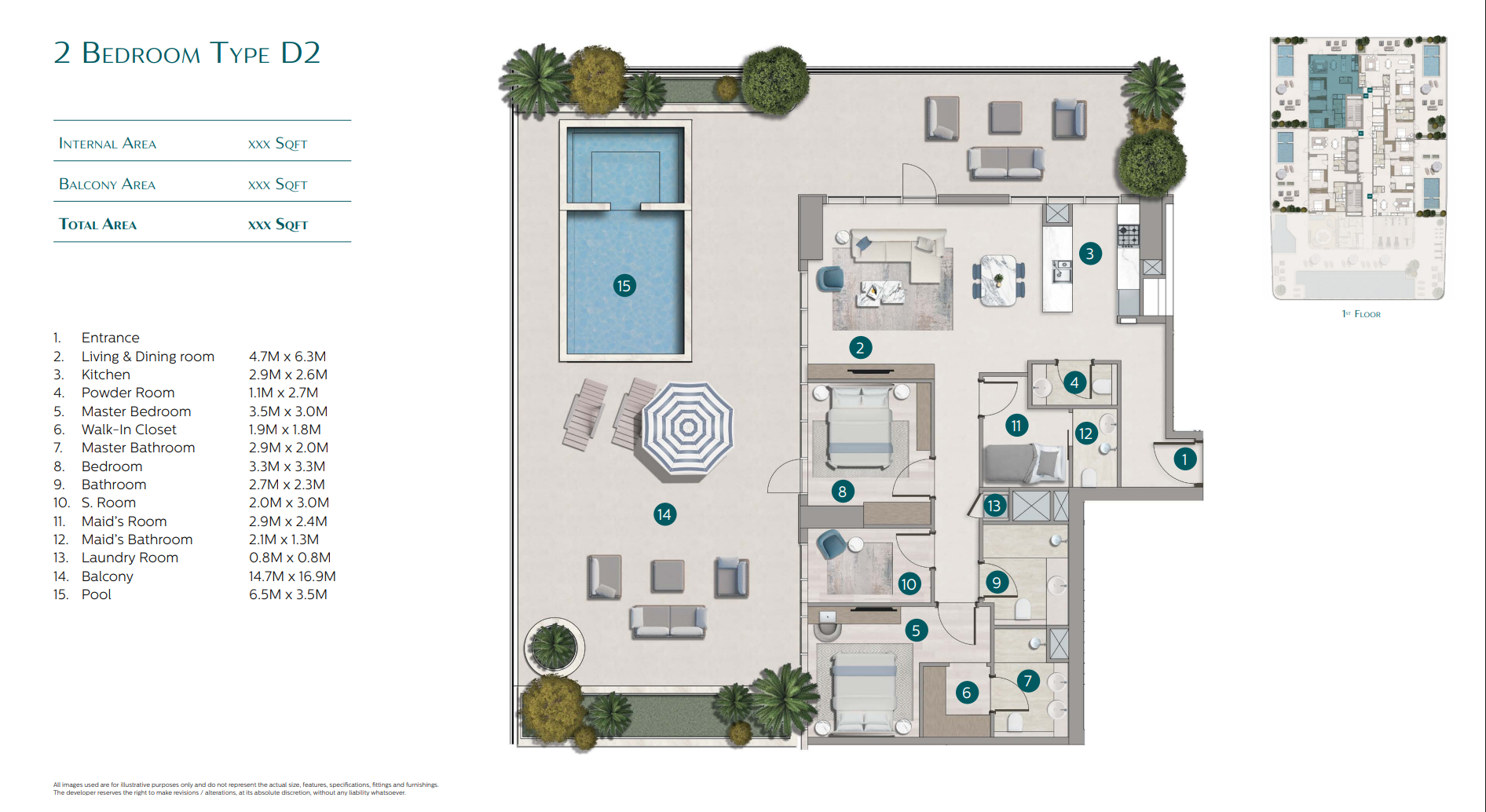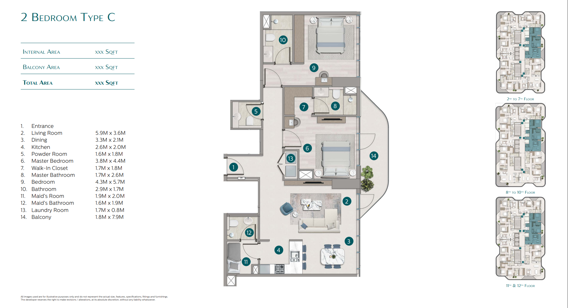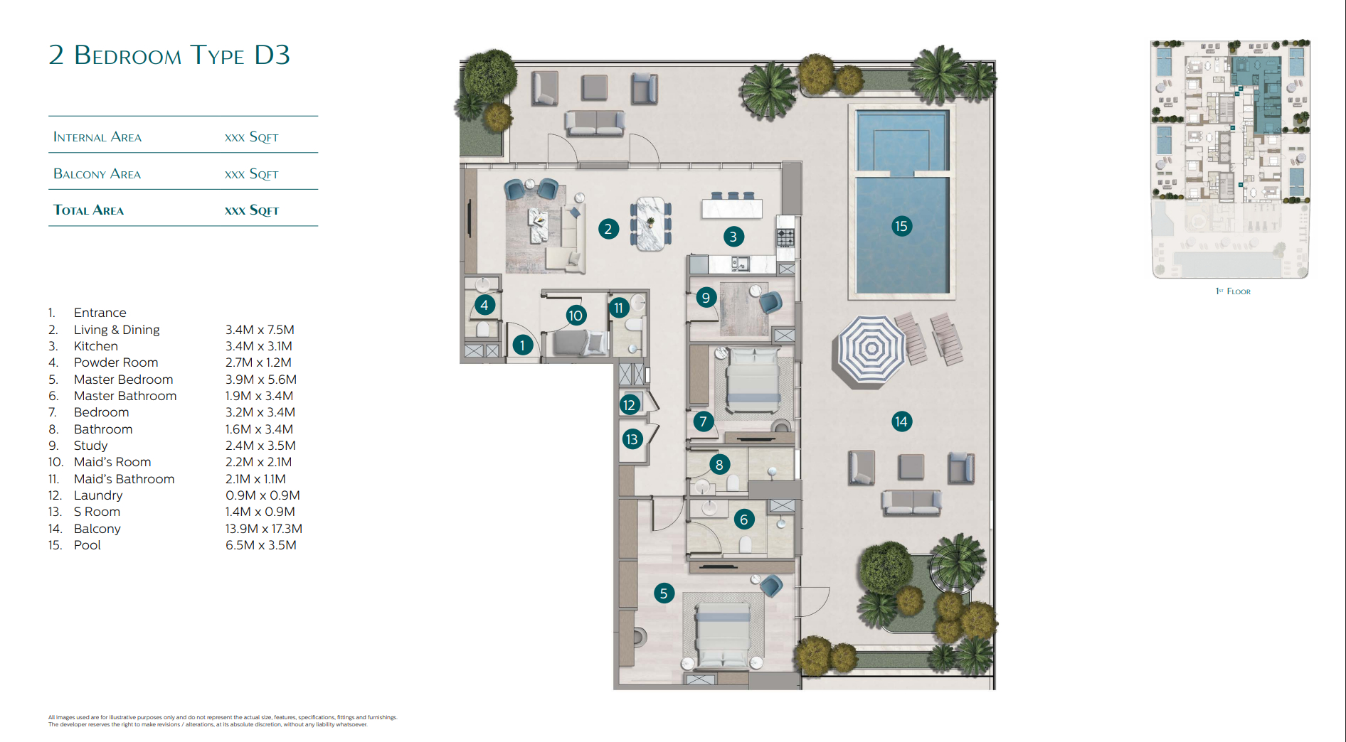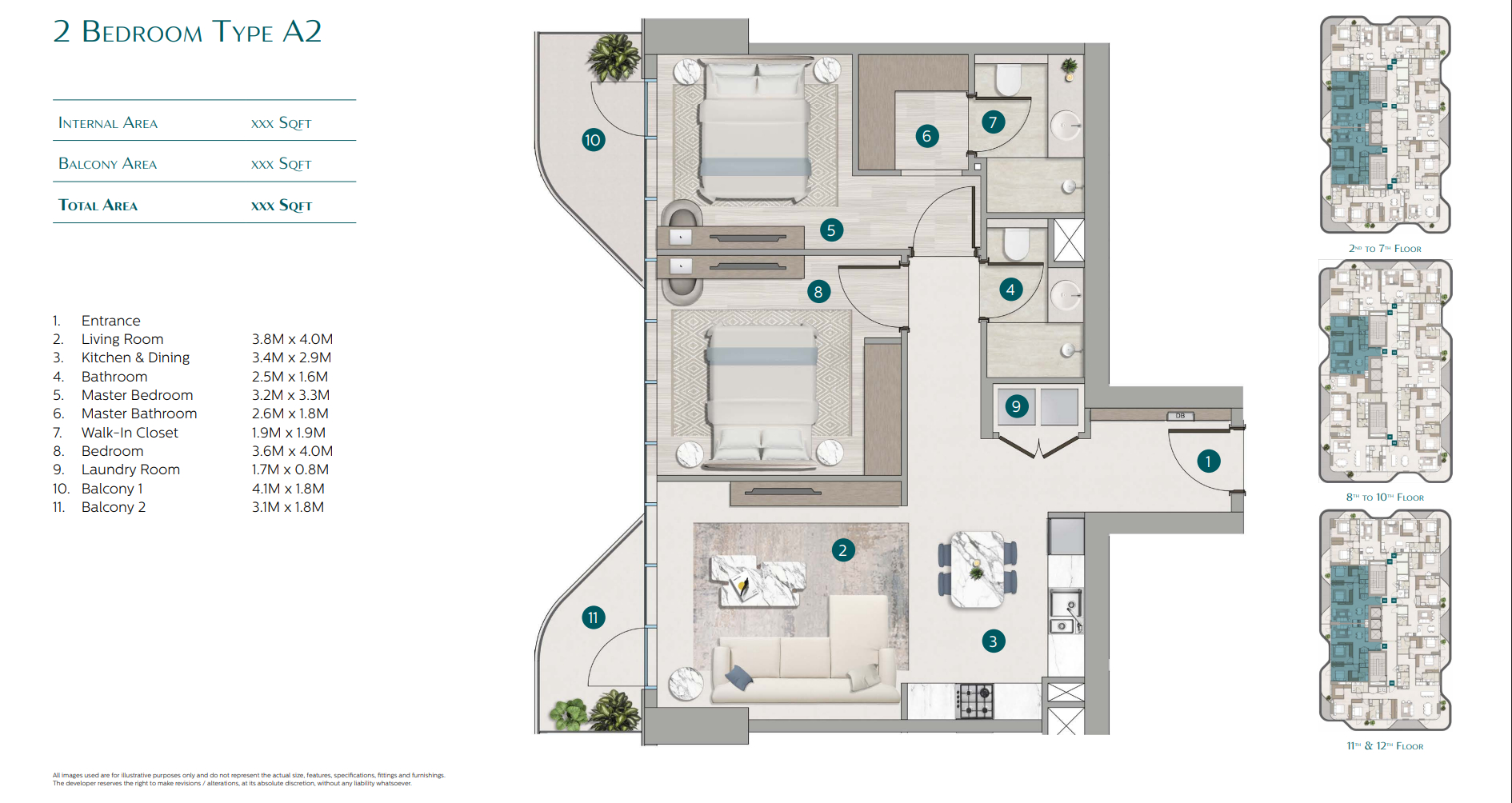Flora Shore offers a refined selection of 2- to 4-bedroom apartments and penthouses, including layouts with maid’s or study rooms. Unit sizes range from 983 to 3,181 sq.ft., with several podium-level apartments featuring private pools and expansive terraces. The collection spans 12 residential floors, combining compact two-bedroom residences with larger family-oriented layouts and exclusive top-floor penthouses overlooking the sea and the Dubai Islands skyline.