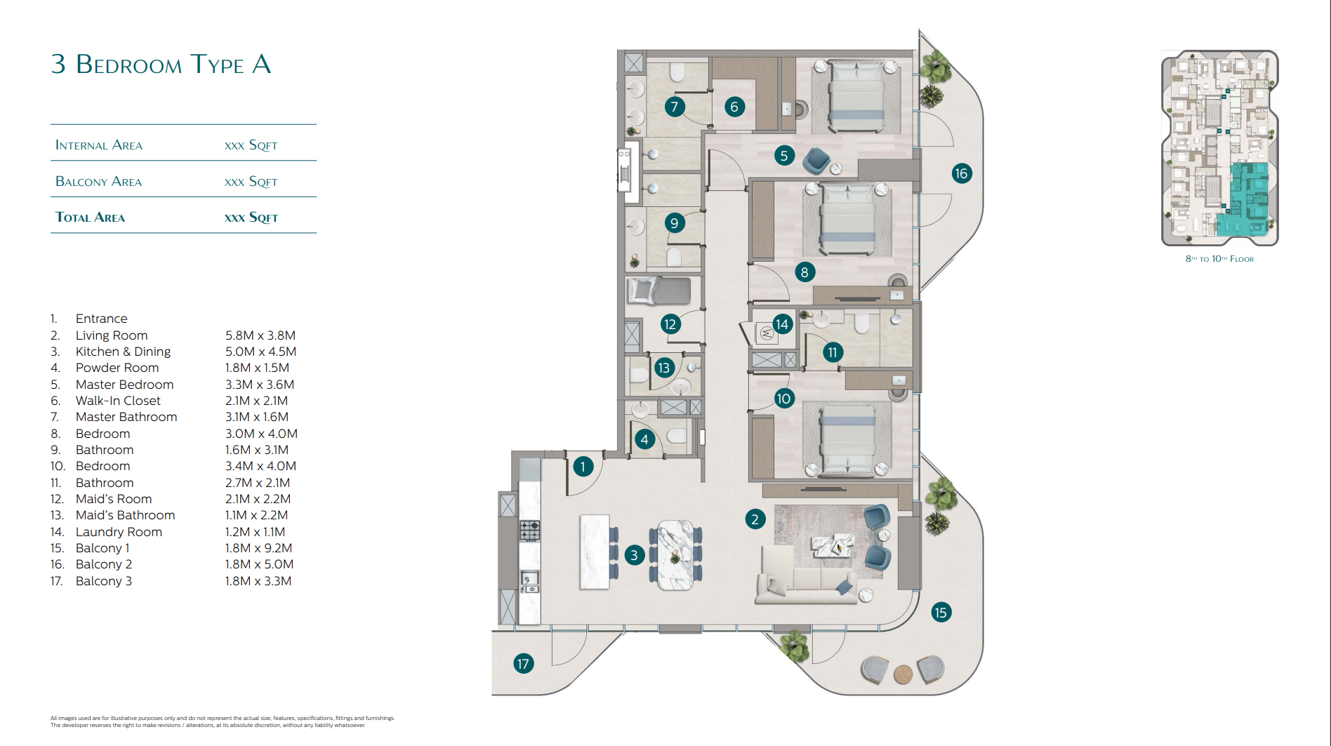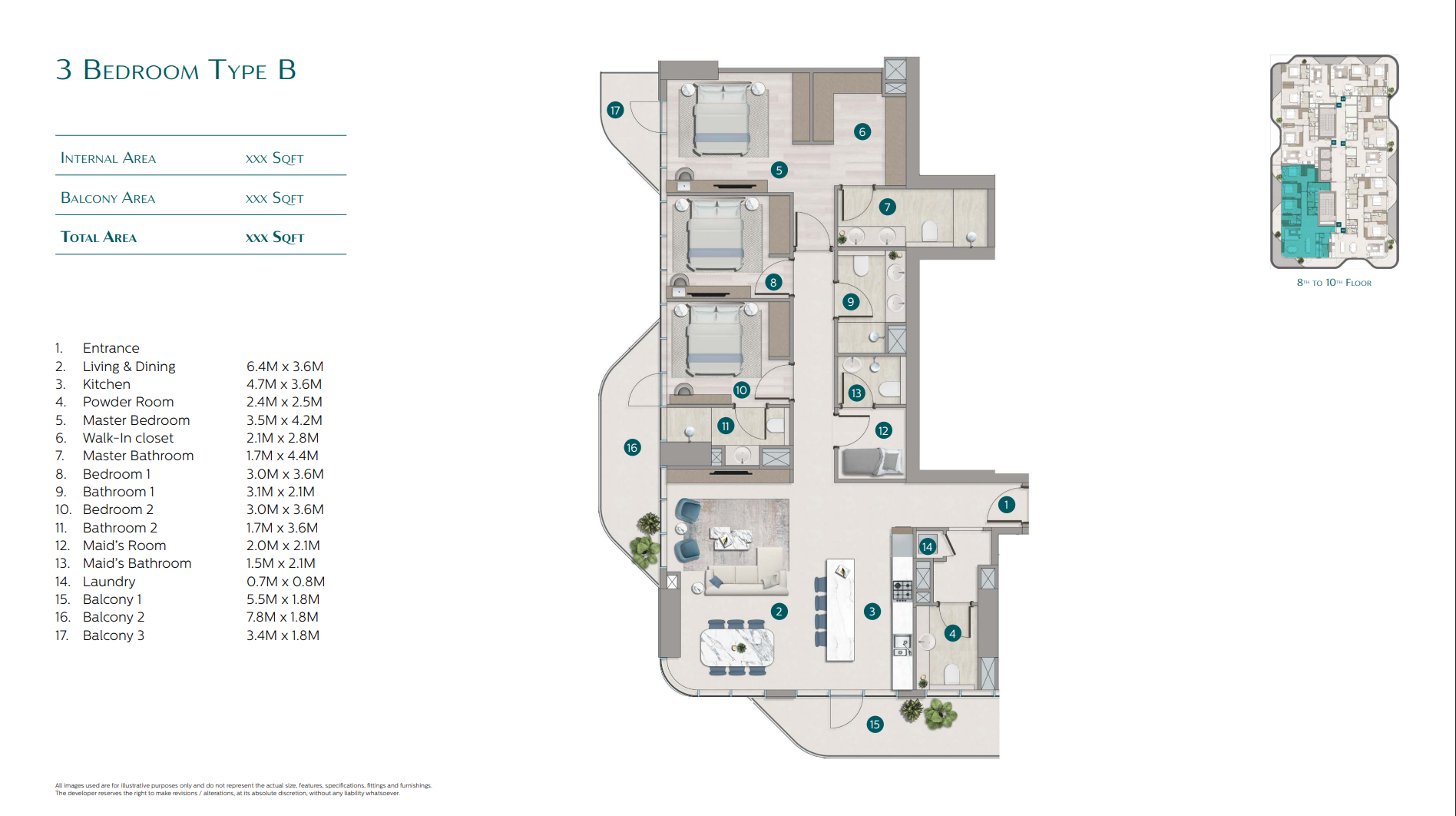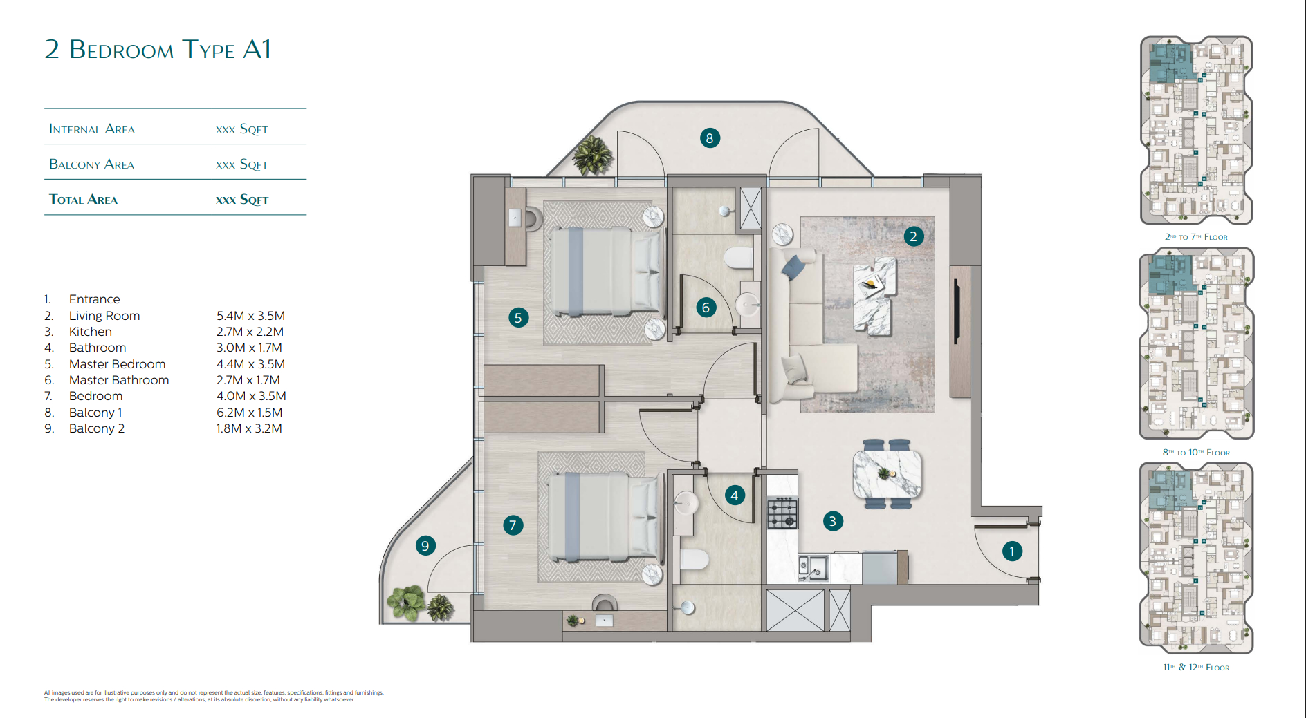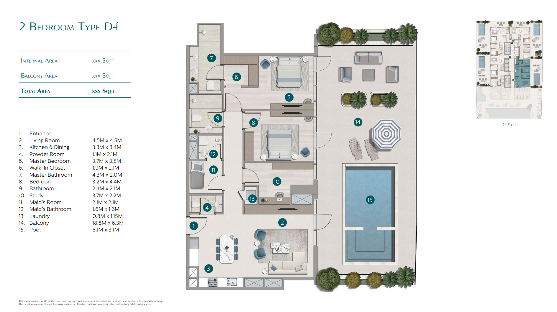 Flora Shore offers a refined selection of 2- to 4-bedroom apartments and penthouses, including layouts with maid’s or study rooms. Unit sizes range from 983 to 3,181 sq.ft., with several podium-level apartments featuring private pools and expansive terraces. The collection spans 12 residential floors, combining compact two-bedroom residences with larger family-oriented layouts and exclusive top-floor penthouses overlooking the sea and the Dubai Islands skyline.