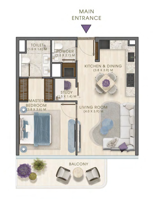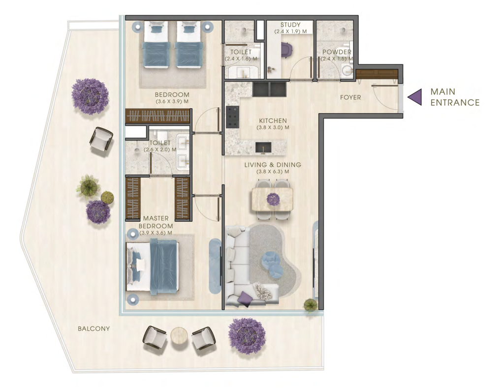 Kaia Residences presents a well-curated selection of homes designed around practical, liveable layouts rather than density-driven planning. The residential mix includes 1-bedroom residences with study, 2-bedroom residences with maid or study, 3-bedroom residences with maid, and a limited number of 4-bedroom duplex homes. Layouts emphasise clear functional zoning, generous living and dining areas, efficient circulation, and direct access to balconies, ensuring natural light, ventilation, and everyday comfort.