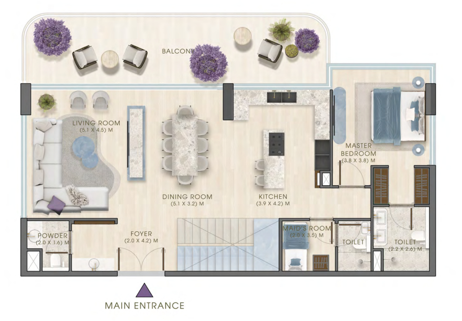 The project offers a diverse range of residences, including 1-bedroom apartments with study, 2-bedroom apartments with maid or study, 3-bedroom apartments with maid, and a limited collection of 4-bedroom duplex homes. This mix is designed to serve end users with varying lifestyle needs while maintaining a cohesive residential environment.