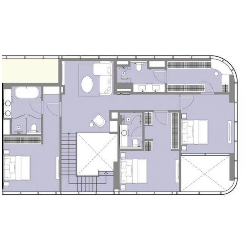 LIV Oceanside integrates an extensive set of wellness, leisure, and lifestyle amenities across the ground floor, podium, and rooftop levels. Spaces include a double-height residents’ lounge, library, cinema, podcast studios, games room, indoor gym, yoga studios, sauna and steam suites, hyperbaric oxygen chamber, red light therapy room, massage suites, children’s areas, and multiple pools — including a rooftop infinity pool overlooking the open sea.