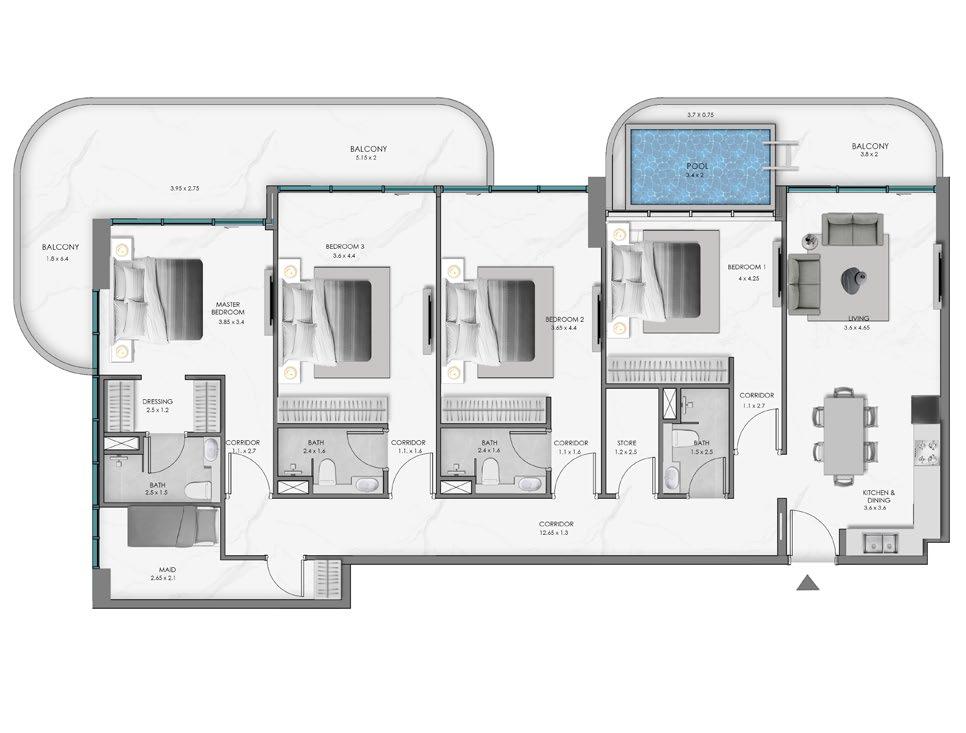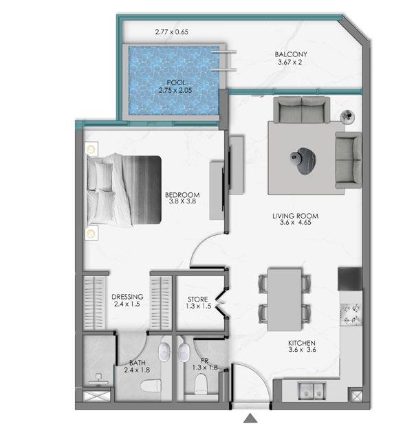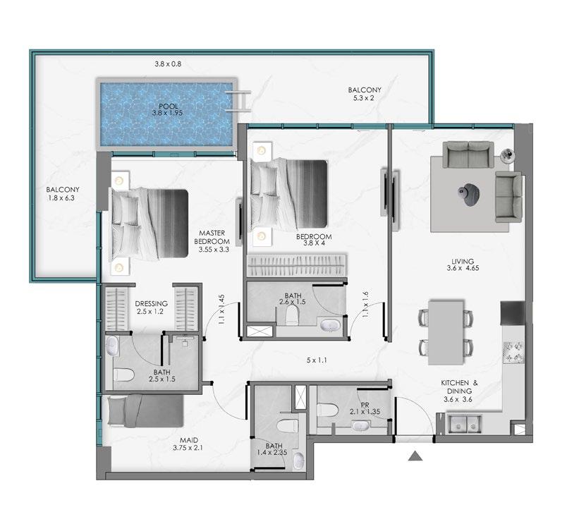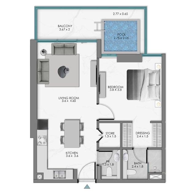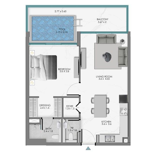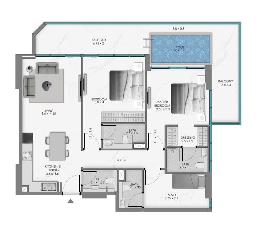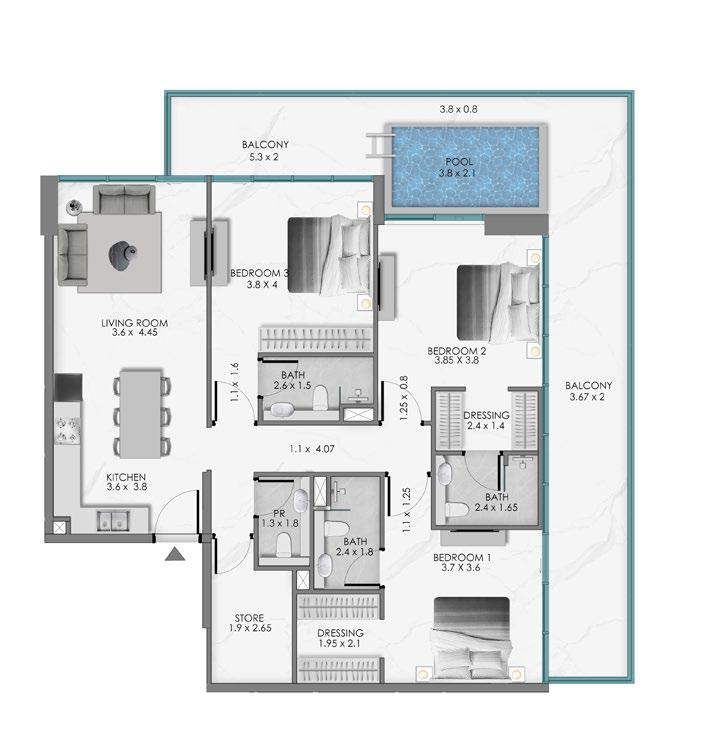 Every apartment includes a private plunge pool positioned on the terrace, separated by safety glass and decorative screens for privacy. Pools vary from 2.5 × 4 m in 1BR units to 4 × 6 m in larger layouts. This concept defines the Samana brand, turning each residence into an independent leisure zone and ensuring every home benefits from outdoor recreation within its own space.