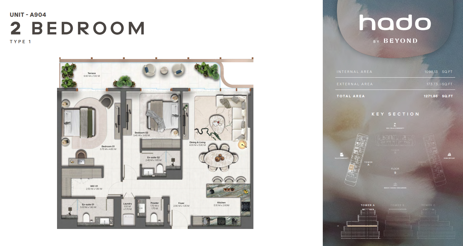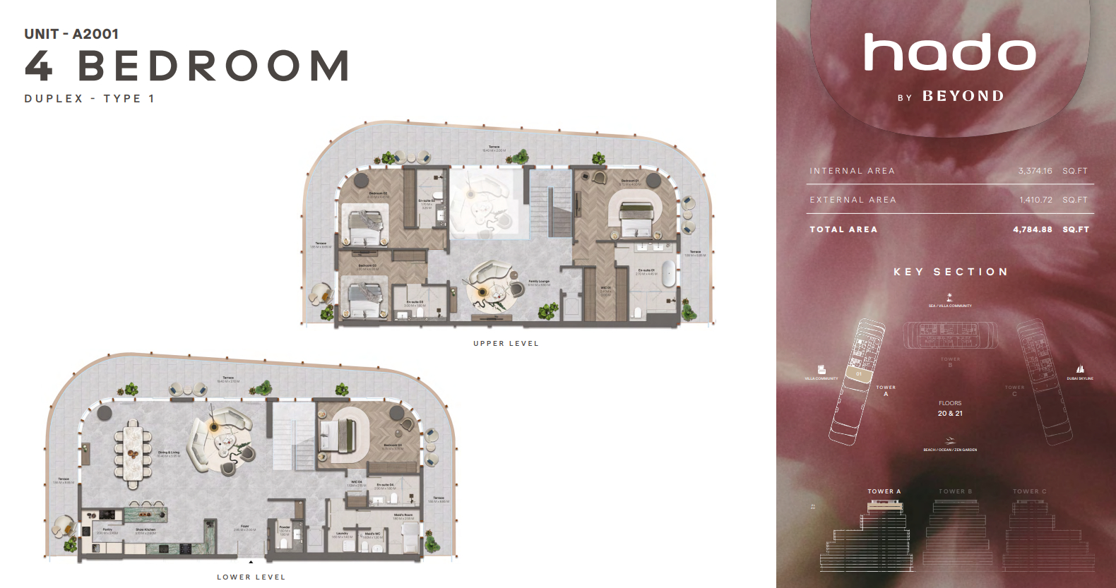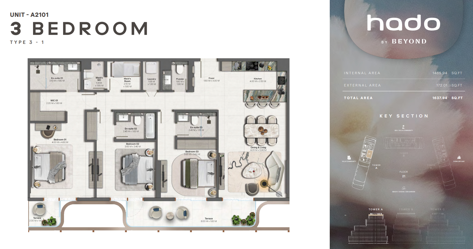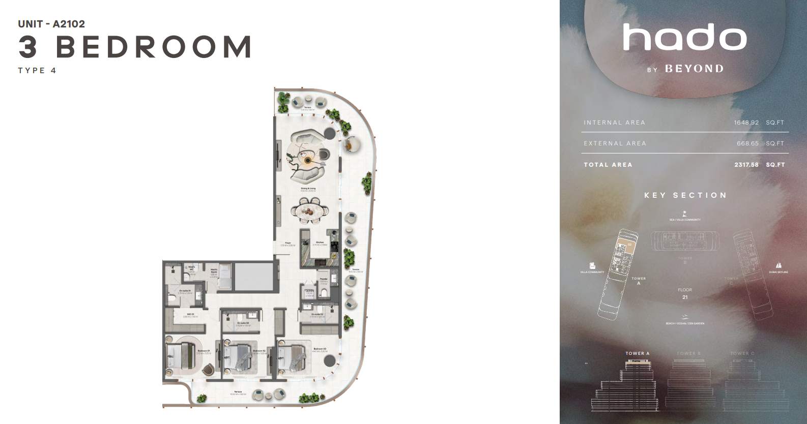 HADO by BEYOND предлагает коллекцию, включающую апартаменты с одной, двумя и тремя спальнями, а также более просторные резиденции формата simplex и duplex с тремя и четырьмя спальнями. Каждая резиденция спроектирована с четким разделением общественных и приватных зон, увеличенной высотой потолков и панорамным остеклением, открывающим виды на море, озелененные внутренние пространства или линию горизонта.