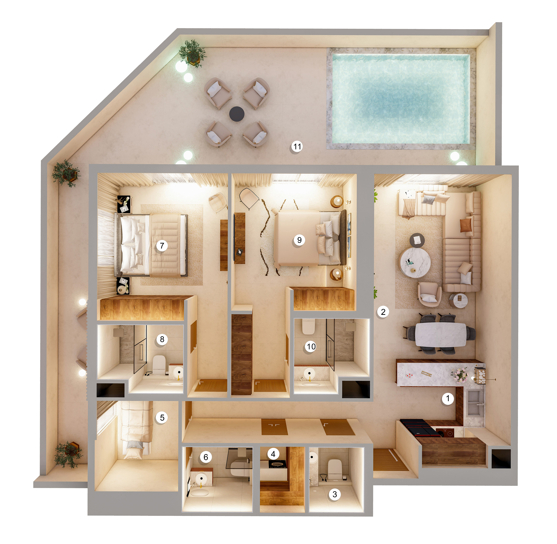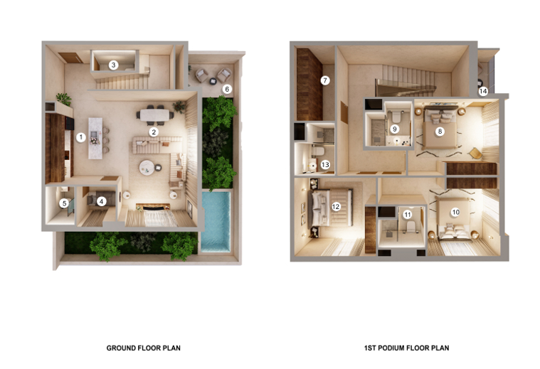 The development features a refined collection of 1-bedroom apartments, 2-bedroom apartments, and 3-bedroom duplex residences with private pools and gardens, designed to balance everyday functionality with elevated living standards. All residences at Ventone are equipped with a fully integrated Alexa Smart Home System, enabling residents to control lighting, climate, and daily home functions through intuitive digital interfaces.
