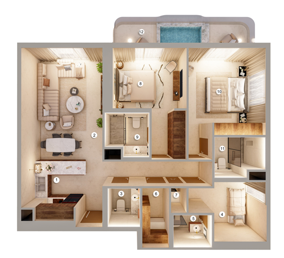 Ventone offers a focused selection of residences designed to combine functional layouts with premium living standards. The unit mix includes 1-bedroom apartments, 2-bedroom apartments, and 3-bedroom duplex residences with private pools and gardens, catering to end users and long-term investors.