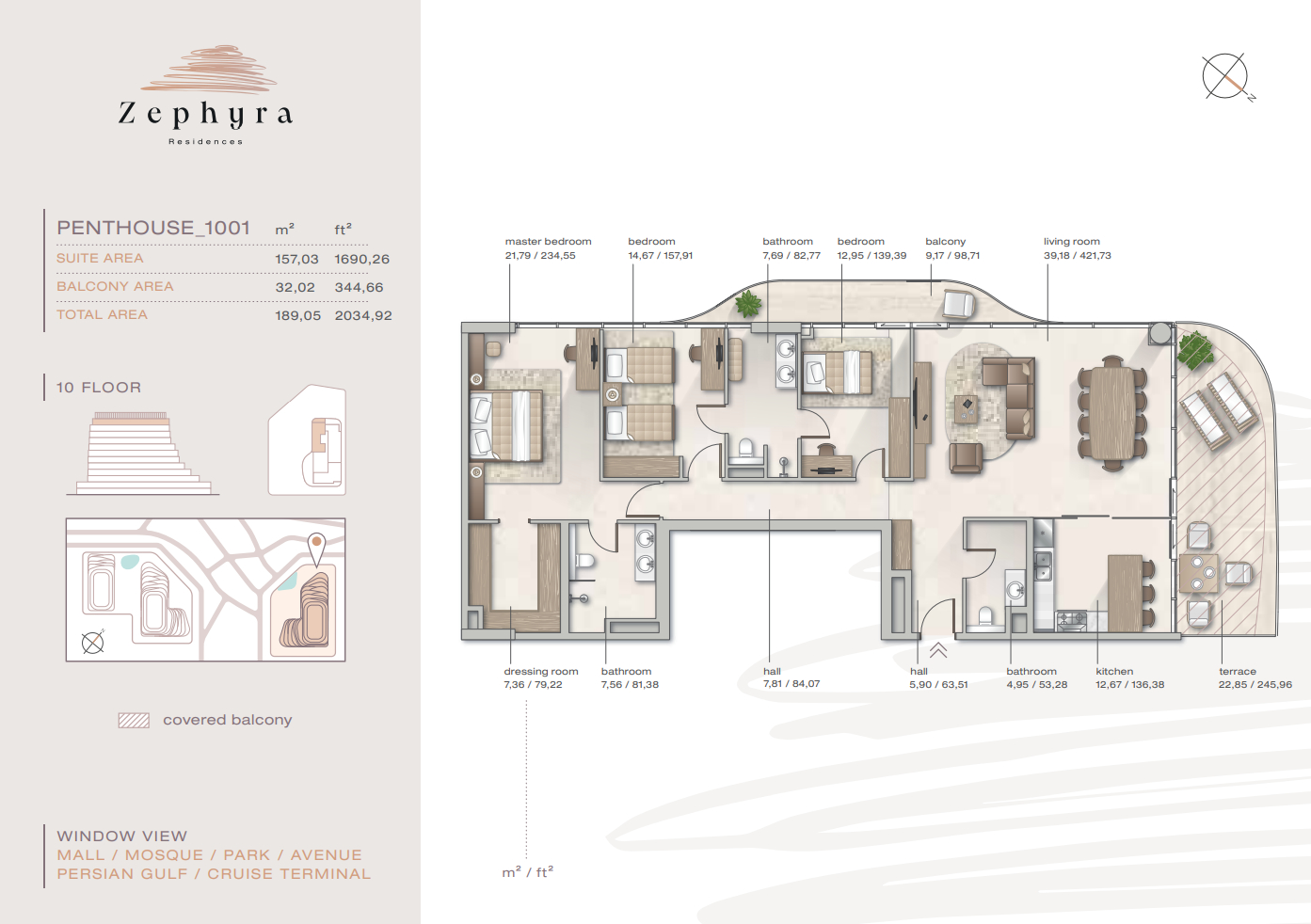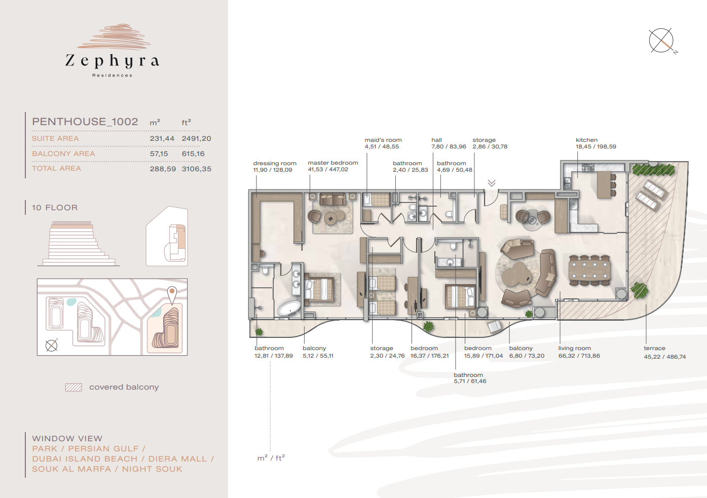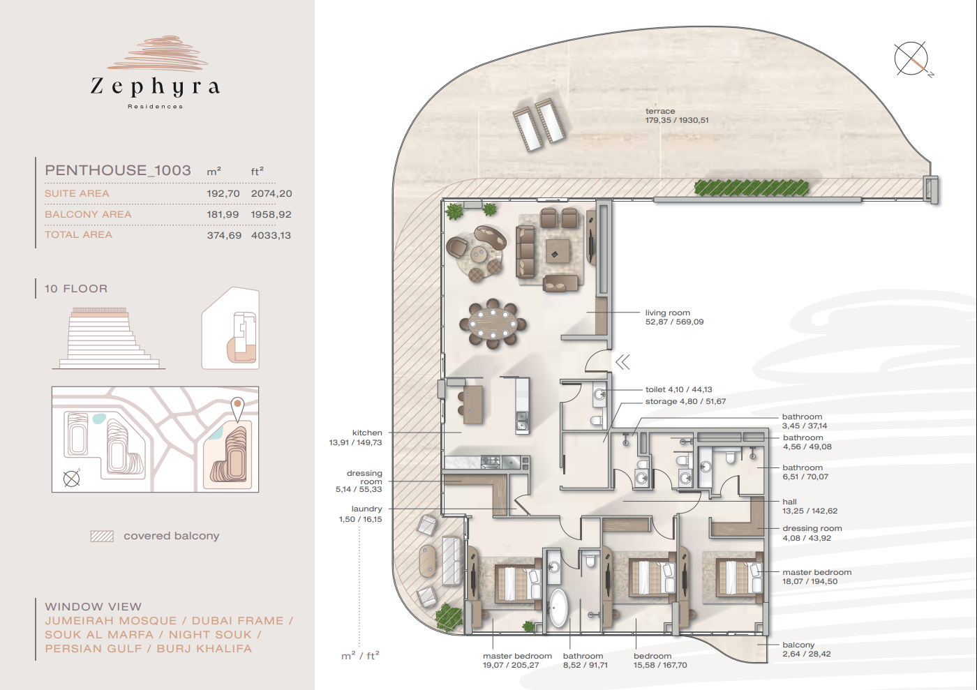 Zephyra offers one-, two-, and three-bedroom apartments, duplexes with garden terraces, and signature penthouses with rooftop spaces. Unit sizes range from 764 sq. ft. (71 sq. m.) for the most compact residences to 4,033 sq. ft. (375 m²) for the largest. Select layouts feature private pools, saunas, or dual-aspect views of the sea and Dubai skyline.